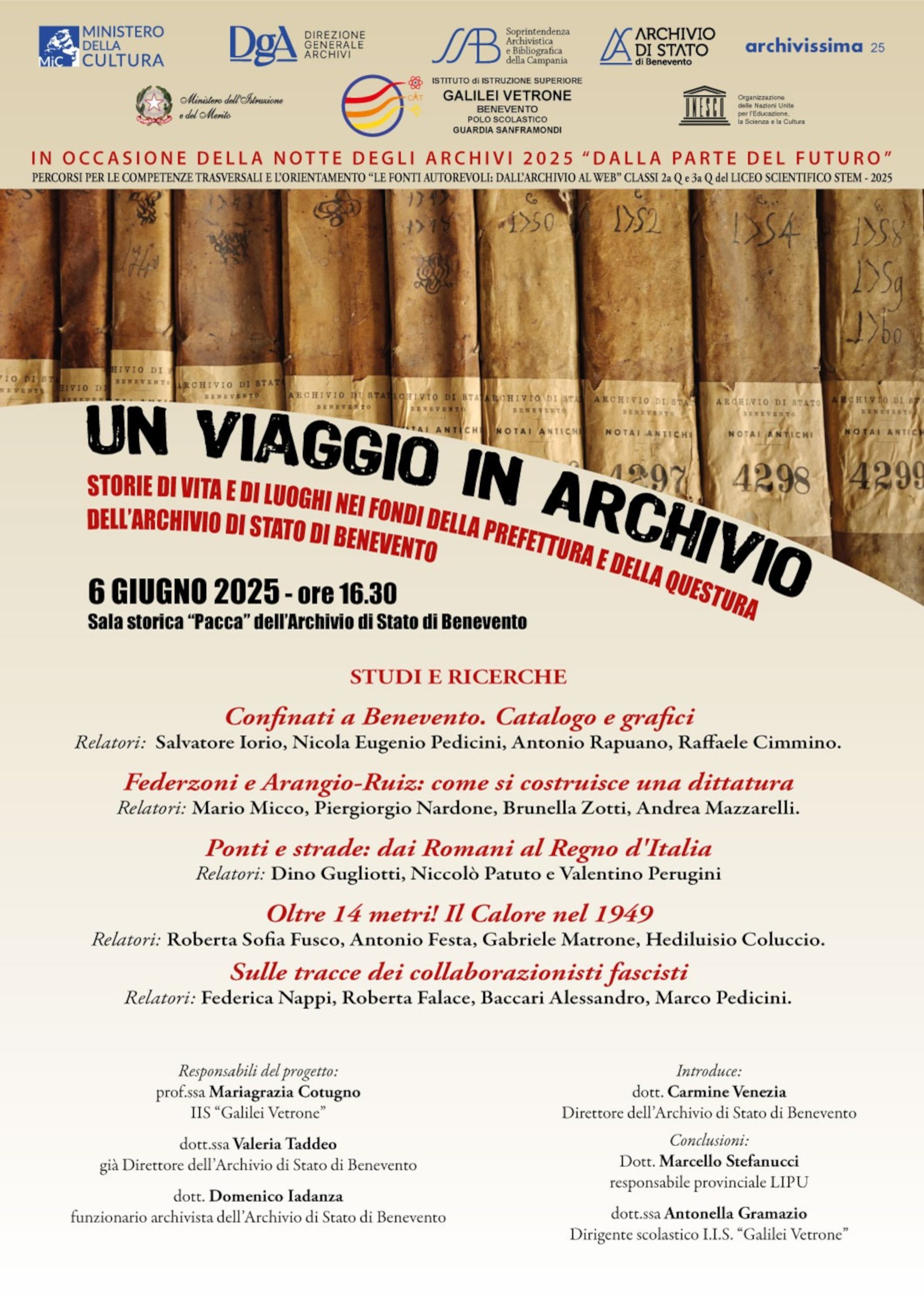Venerdì 6 giugno, a partire dalle 16:30, l’Archivio di Stato parteciperà al festival “Archivissima” manifestazione realizzata con la collaborazione della Direzione generale Archivi. L’evento comprende un’ampia varietà di iniziative, tra cui visite guidate, mostre, incontri, proiezioni, performance, podcast, video, dedicate a valorizzare il patrimonio archivistico. Il nostro Archivio proporrà una conferenza in collaborazione con il Liceo scientifico STEM dell’Istituto di istruzione superiore Galilei-Vetrone di Benevento, che prevederà l’illustrazione delle ricerche su documenti della Prefettura e della Questura di Benevento condotte dagli studenti nel corso di un progetto formativo. L’evento sarà fruibile anche in diretta Facebook.